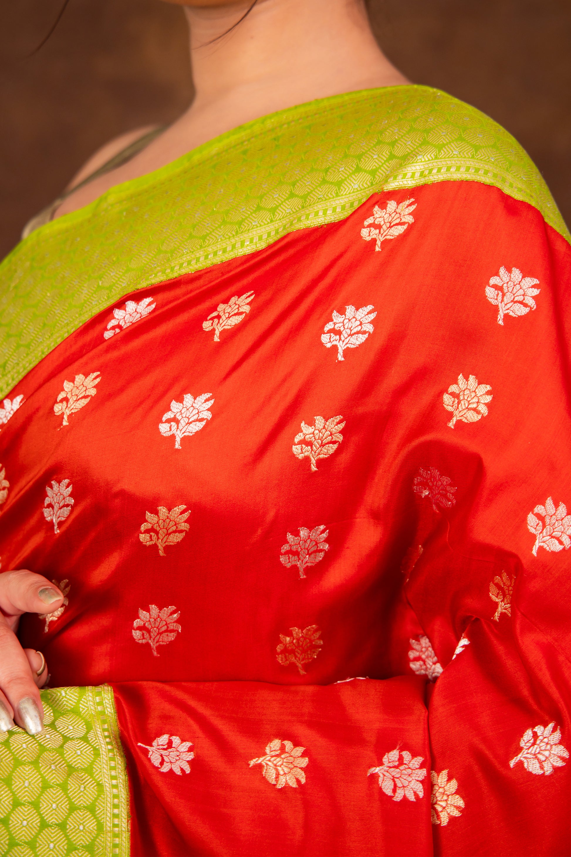 Speciality – A gorgeous silk body woven in the finest kadhua style with an geometrical border and pallu. An absolutely elegant and understated Banarasi weave with with Contrast Selvedge and Blouse