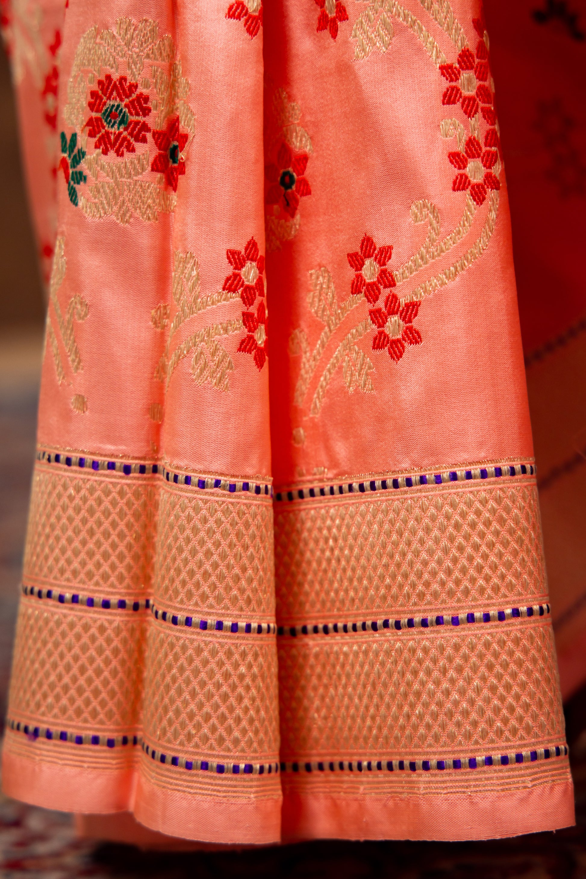 • Technique – An enduring Kadwa weave with Meenakari. The elaborate and laborious Kadwa (Kadhua) technique involves hand-weaving each motif separately. It takes longer on the handloom but makes a more robust pattern, which stands out on the fabric.