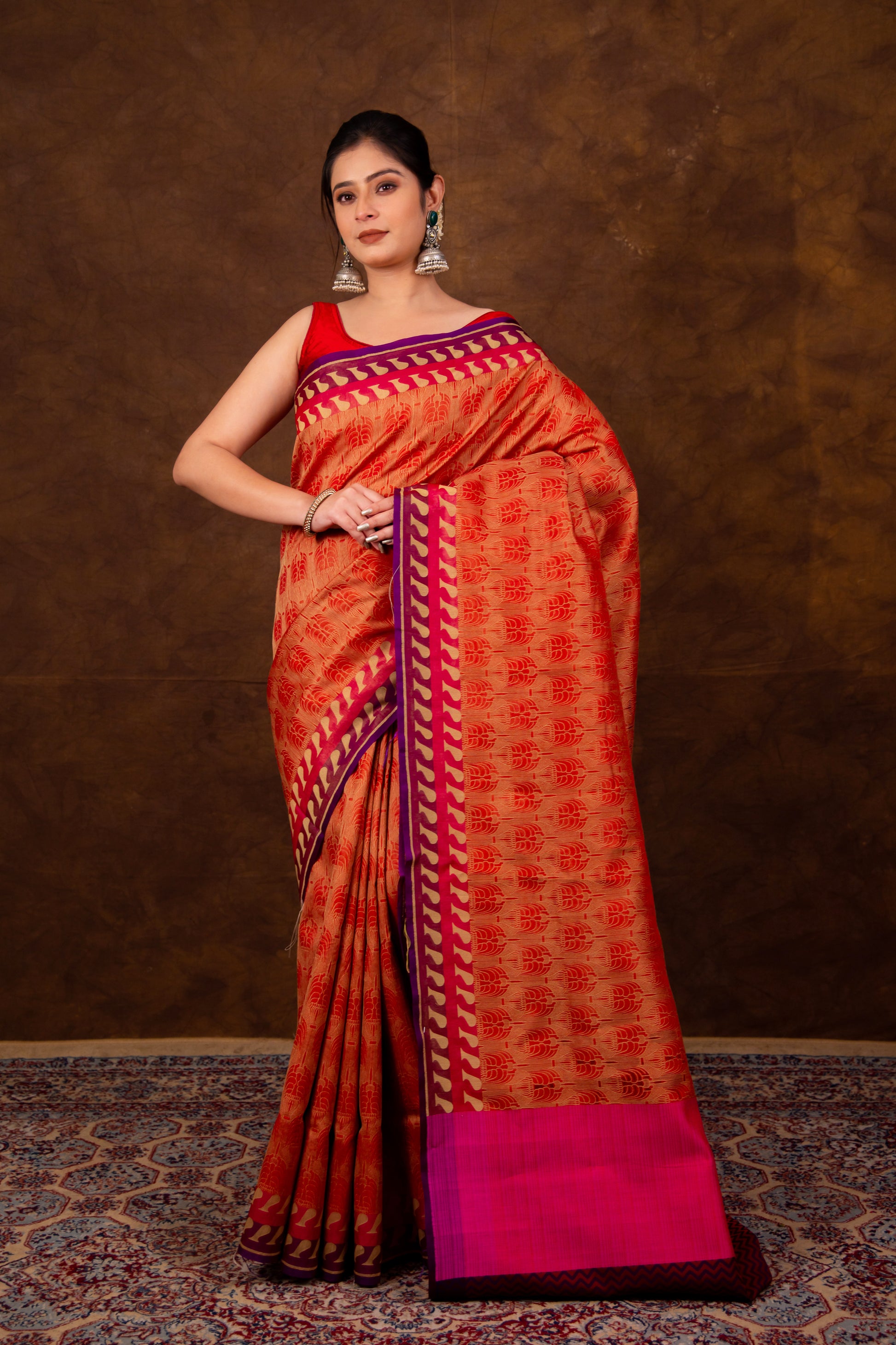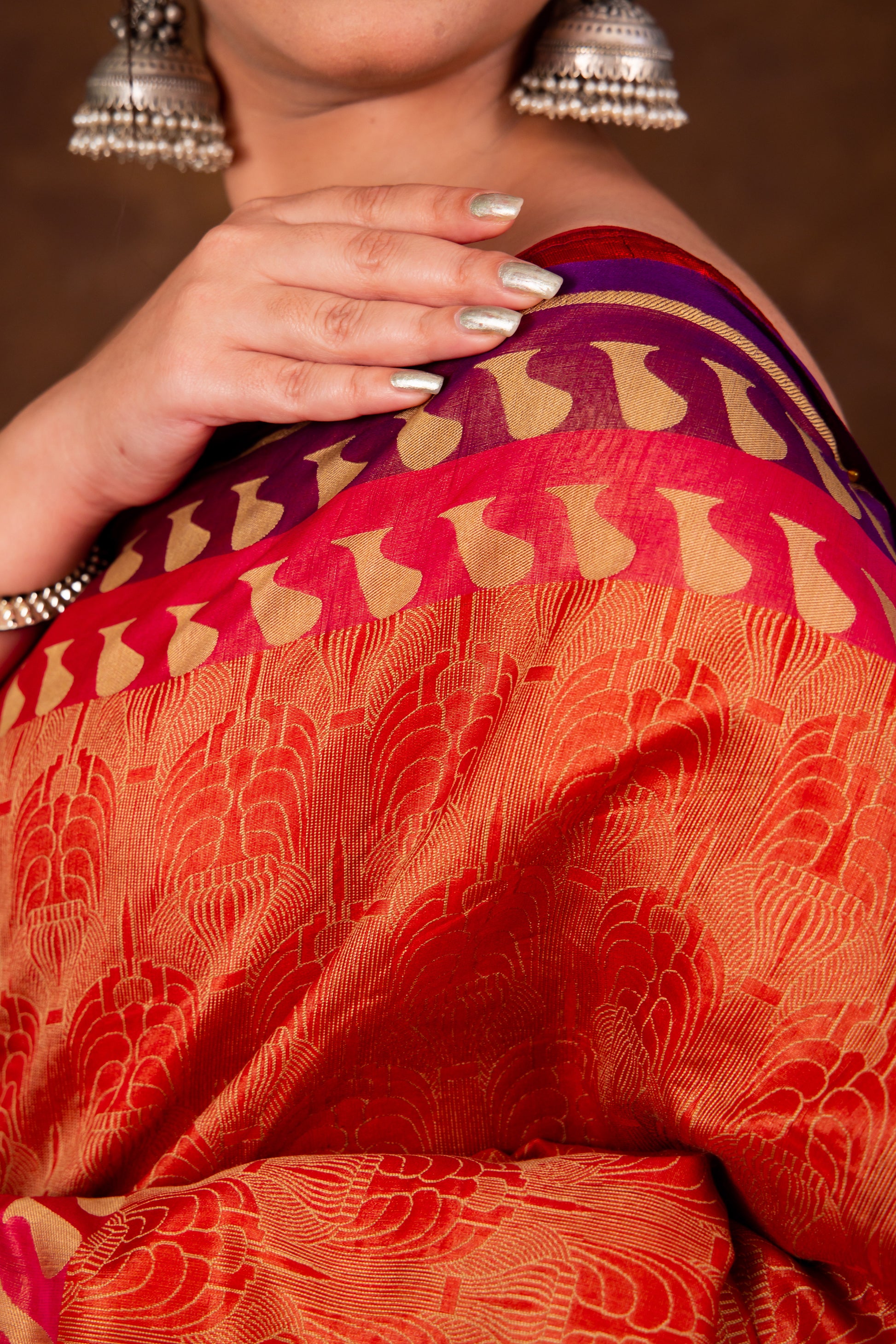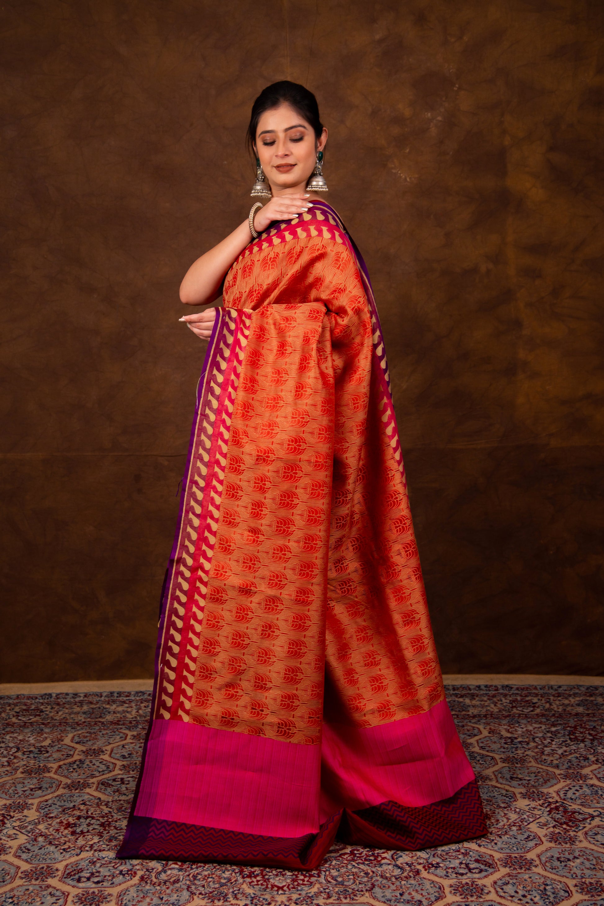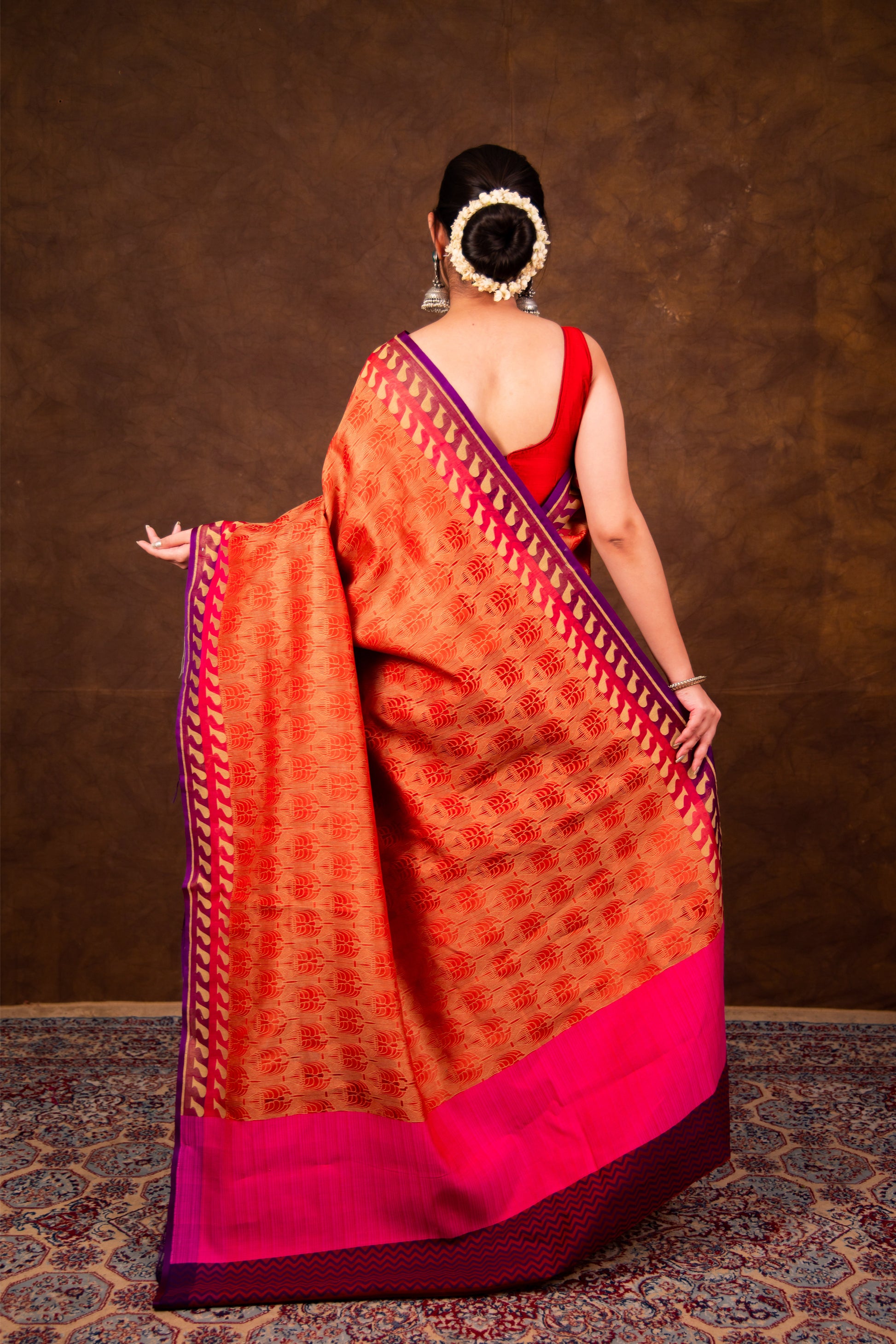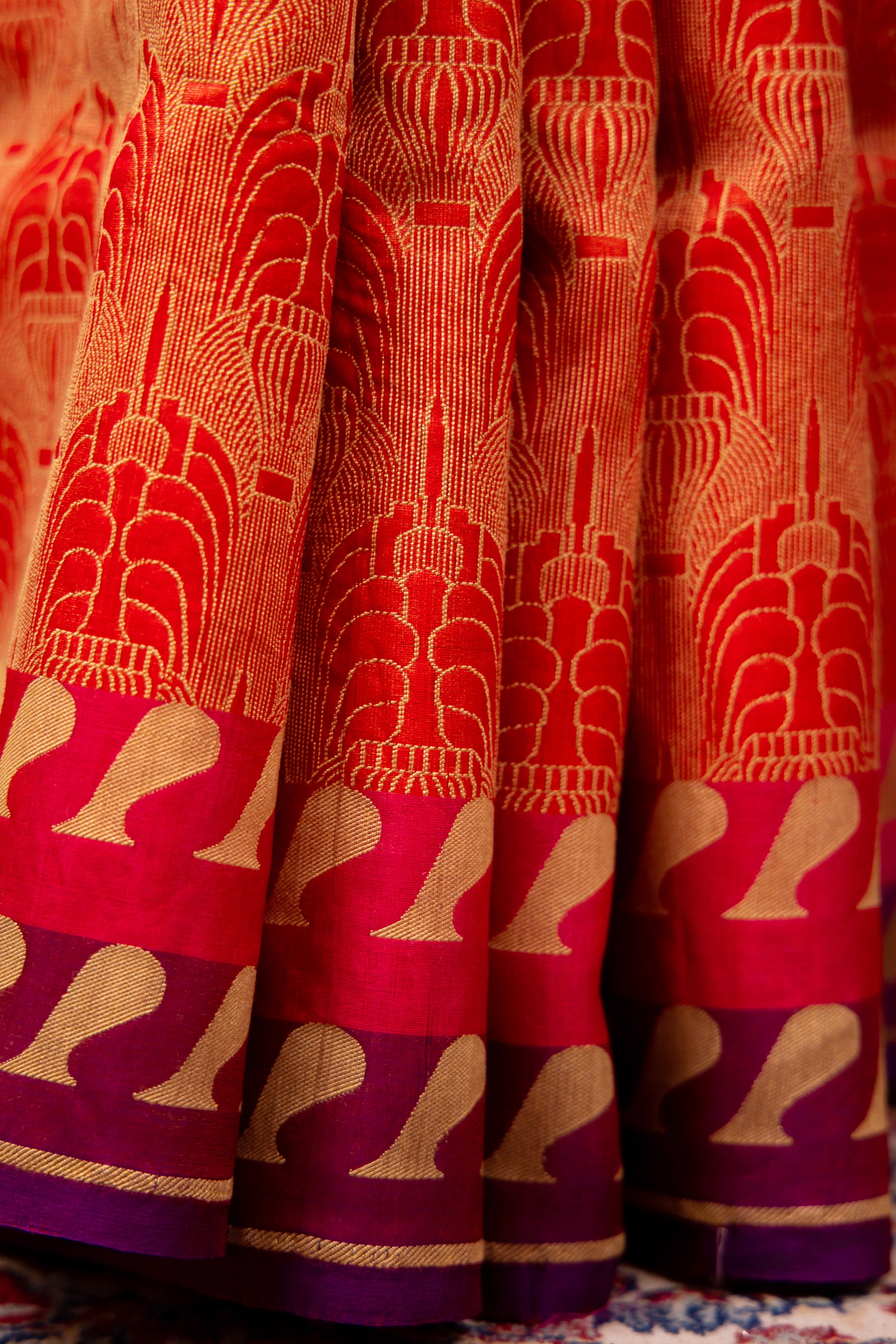 - Technique – An enduring Fekwa body weave and kadhwa border weave. The elaborate and laborious Kadwa (Kadhua) technique involves hand-weaving each motif separately. It takes longer on the handloom but makes a more robust pattern, which stands out on the fabric.