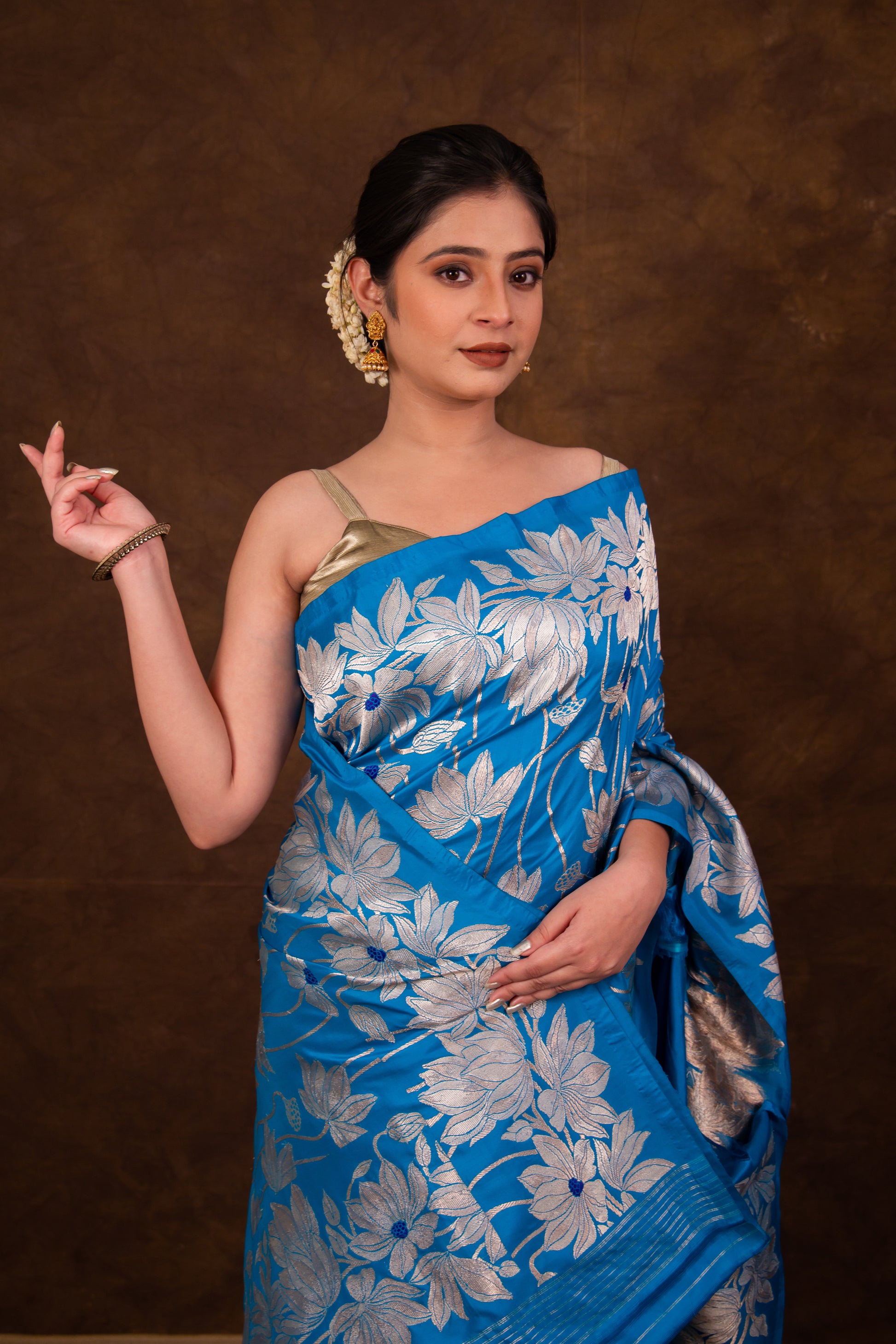 Speciality – A gorgeous silk body woven in the finest kadhua style with an geometrical border and pallu. An absolutely elegant and understated Banarasi weave with with Contrast Selvedge and Blouse